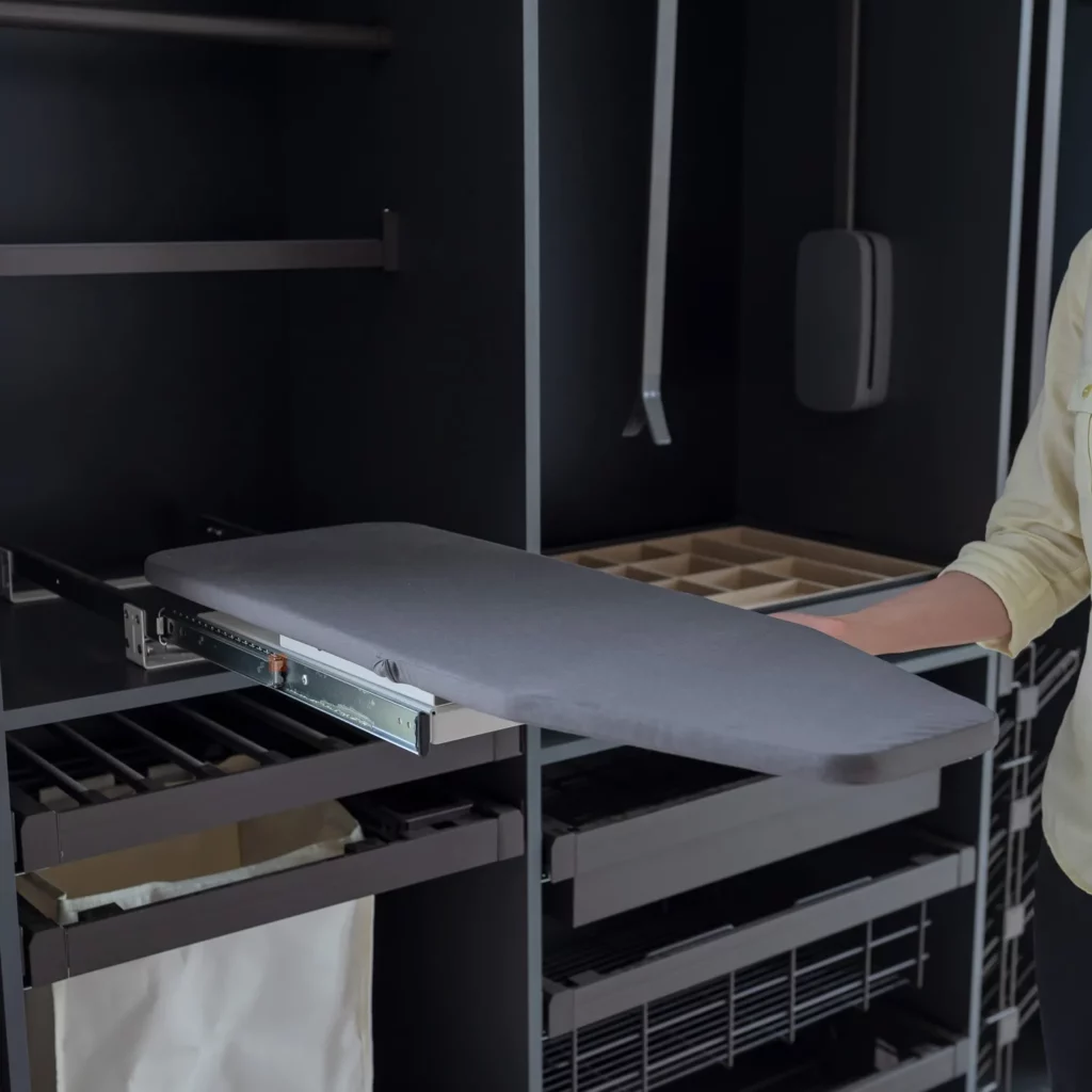 Składana deska do prasownia do montażu wewnątrz szafy, kiedy jest złożona, zajmuje mniej miejsca niż tradycyjne deski do prasowania. Dodatkowo pozostaje ukryta za frontem.