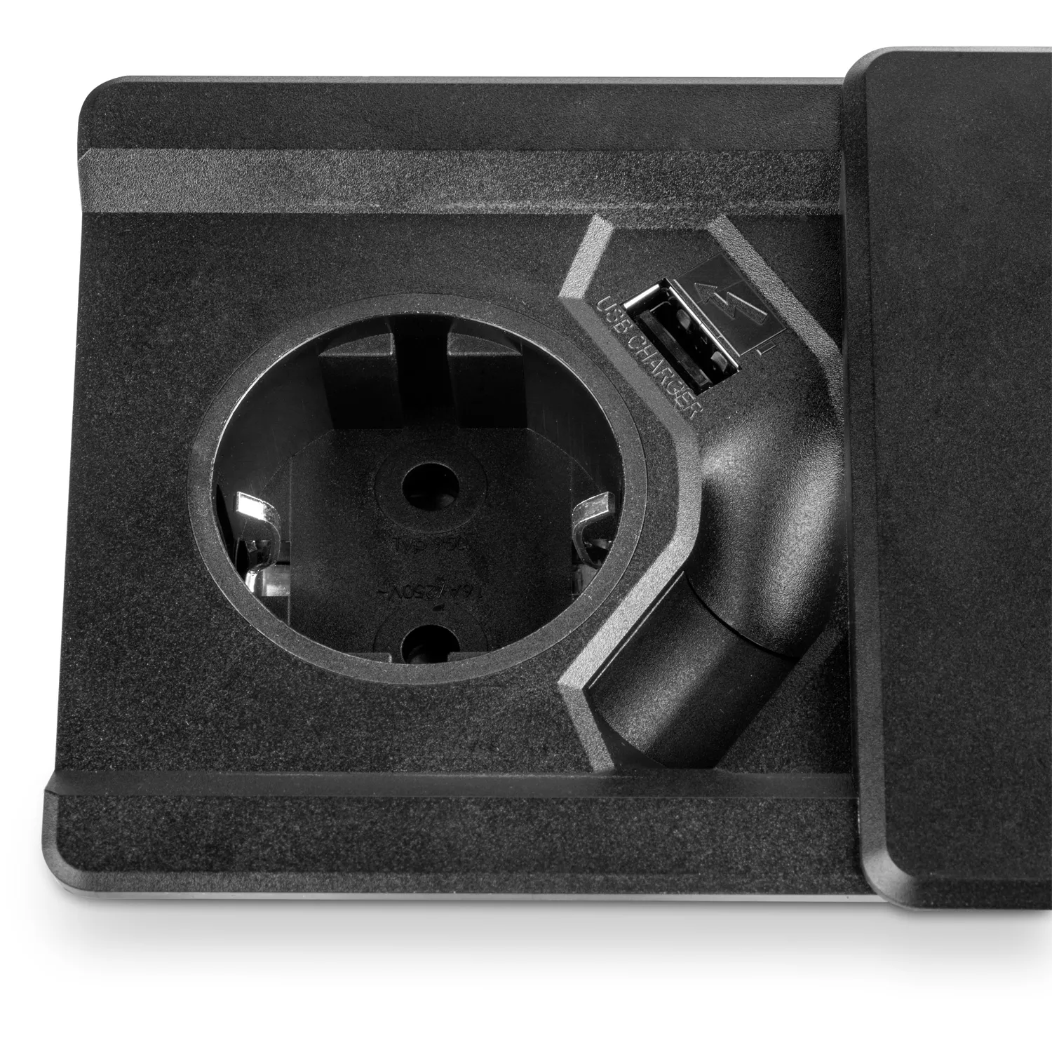 Gniazdo wpuszczane Square 80 z USB Emuca to praktyczna i stylowa listwa z jednym gniazdem, wykonana z trwałego tworzywa sztucznego. Idealnie pasuje do mebli kuchennych, biurowych i domowych, dodając im funkcjonalności i nowoczesnego wyglądu. Jej powierzchnia została pomalowana na czarno, co nadaje jej nowoczesny wygląd. Listwa posiada innowacyjną konstrukcję, która umożliwia ukrycie gniazdek, gdy nie są używane. Dzięki lekkiemu dotknięciu, listwa obraca się, ujawniając dostęp do gniazdek.