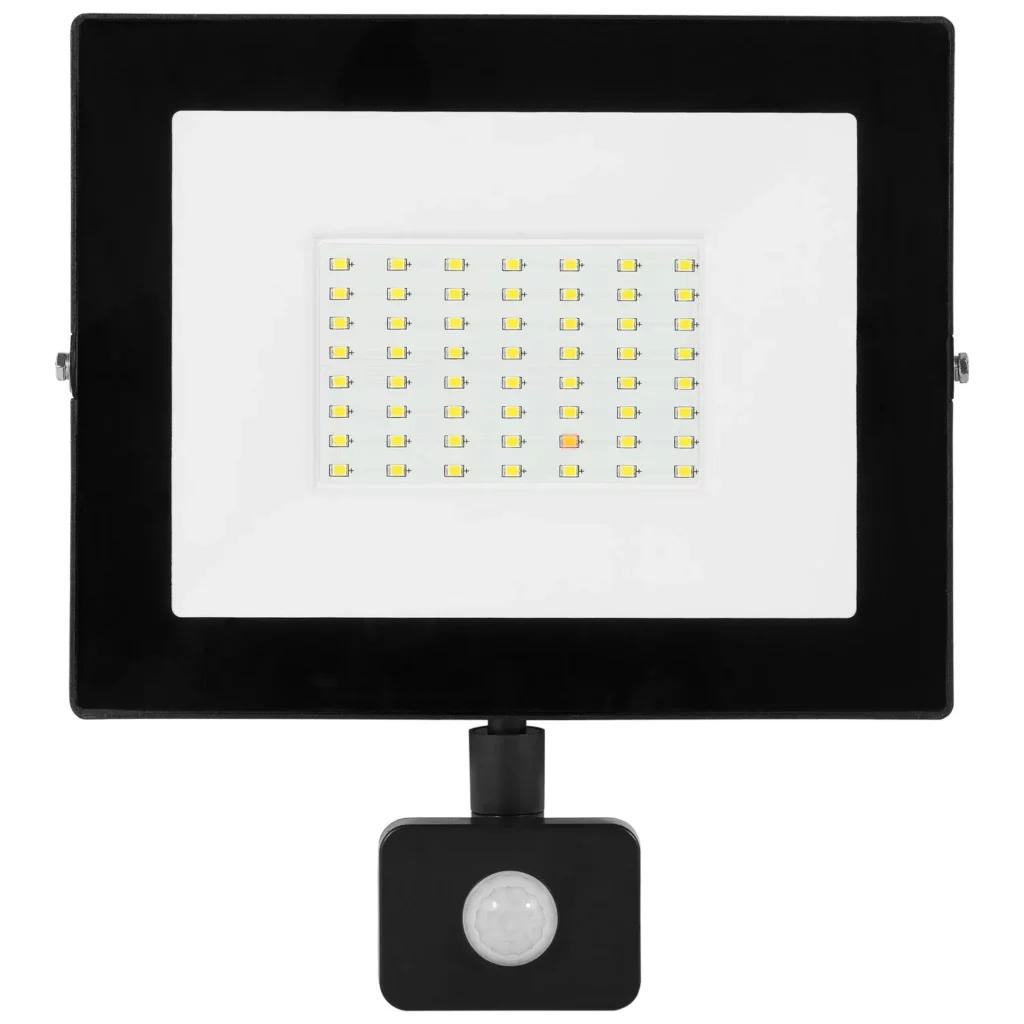 Halogen Lampa Naświetlacz LED 50W biały zimny z czujnikiem ruchu z wbudowanymi diodami LED to idealne źródło oświetlenia magazynów, parkingów, sklepów itp. Wykonany jest z wysokiej jakości materiałów. Lampa cechuje się szczelnością klasy IP 65, dzięki czemu można ją stosować na zewnątrz (w temperaturze od -15°C do +35°C). Wysoki współczynnik oddawania barw (CRI > 70) zapewnia żywe kolory. Naświetlacz wyposażony jest w czujnik ruchu.