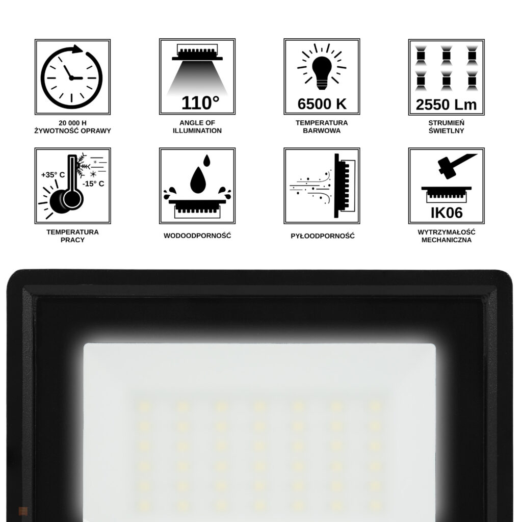 Naświetlacz charakteryzuje się wysokim współczynnik oddawania kolorów: RA>70, żywotnością 20 000 H oraz kątem świecenia 110° – dzięki czemu oświetla dużą powierzchnię.