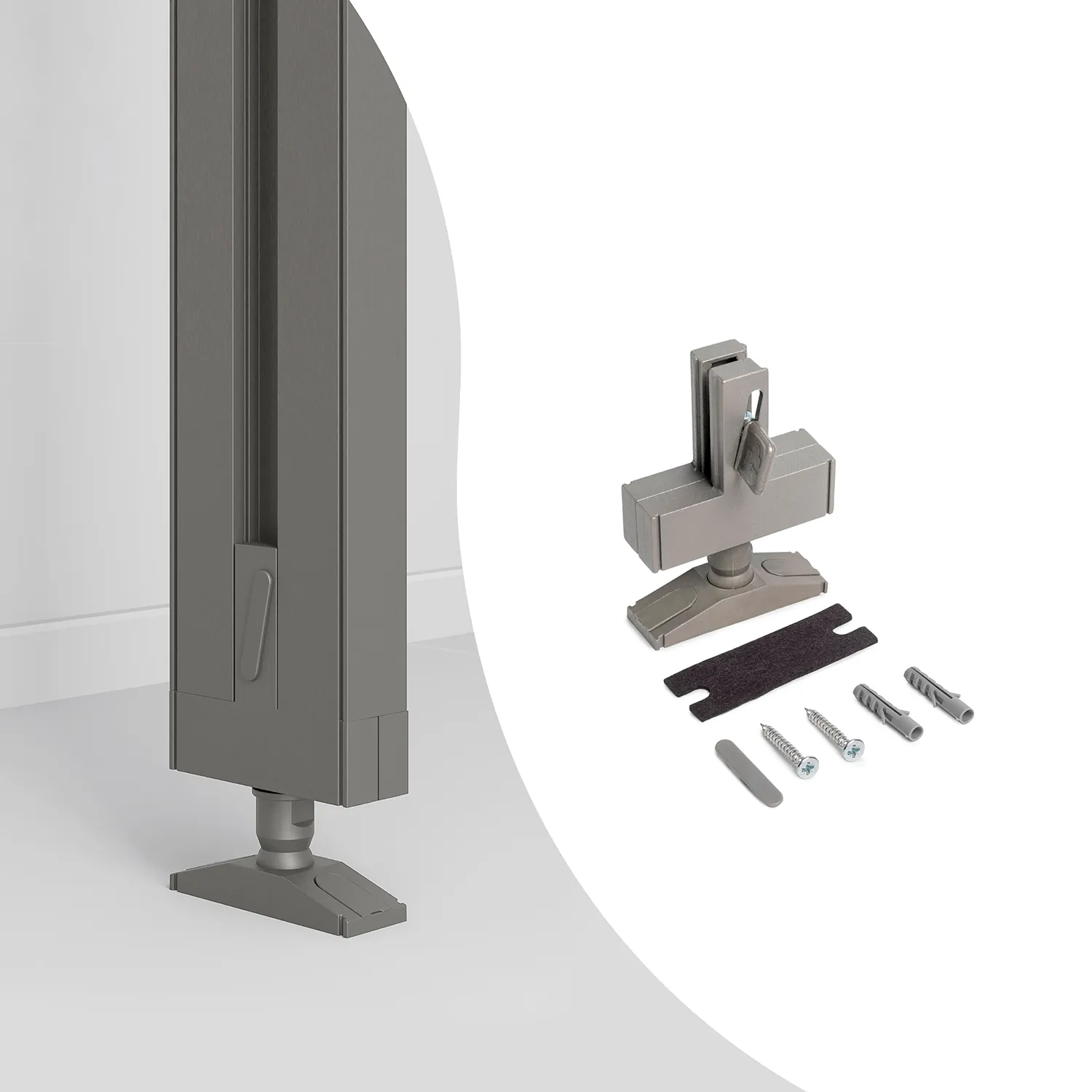 Komplet mocowań do podłogi/sufitu ZERO Kaszmir służy do mocowania do podłogi, dodatkowo można jej używać do mocowania do sufitu. Akcesoria łączące i wsporniki wykonane ze znalu, a wszystko wykończone w kolorze szarego kamienia teksturowanego (RAL 7048). Prostota i design pozwalają na szybkie dostosowanie systemu Zero do przestrzeni dowolnego typu: domostwo, garderoba, biuro czy sklep. Możesz łączyć różne elementy, aby stworzyć idealną kompozycję: drewniane lub szklane półki, moduły lub małe szafki i drążki na wieszaki.