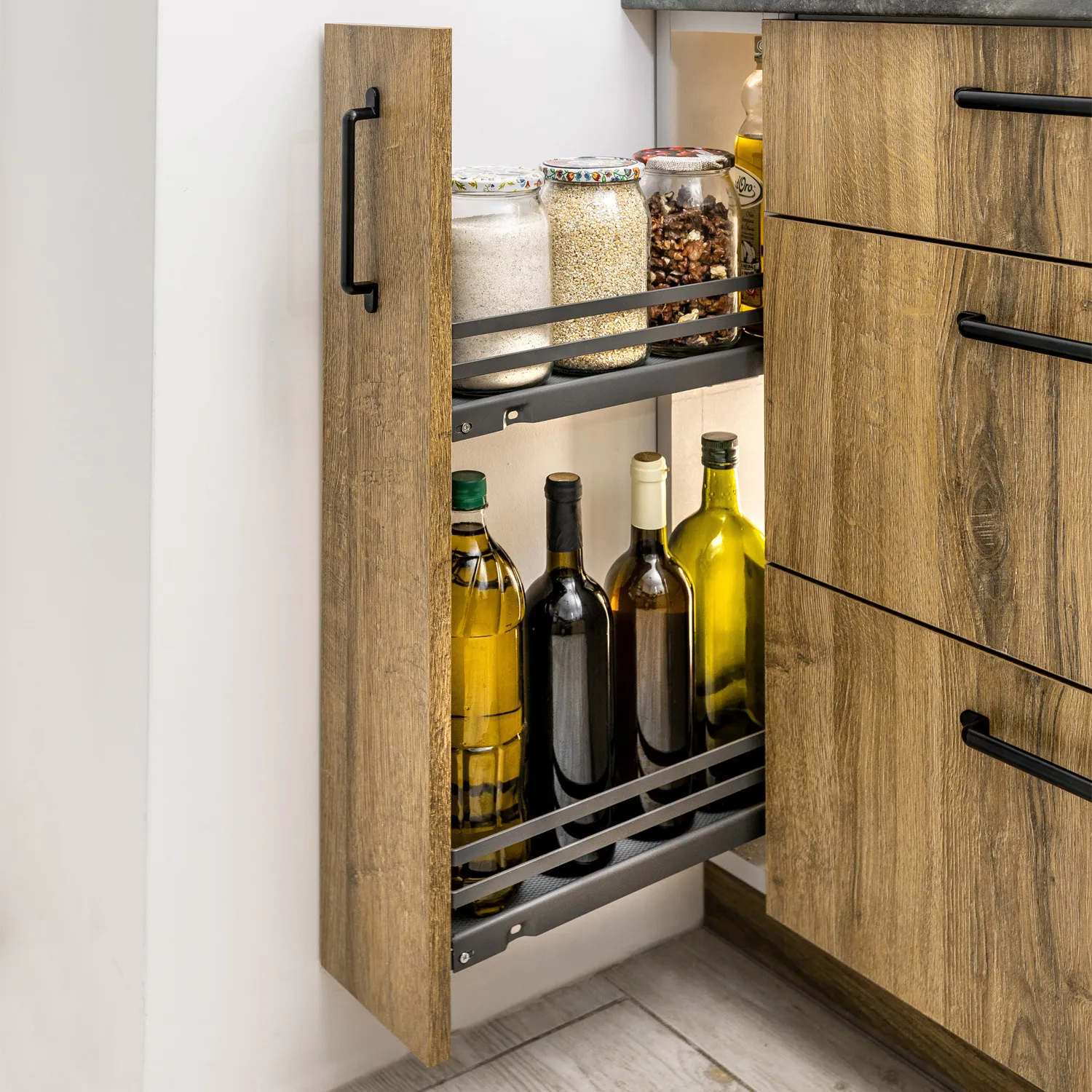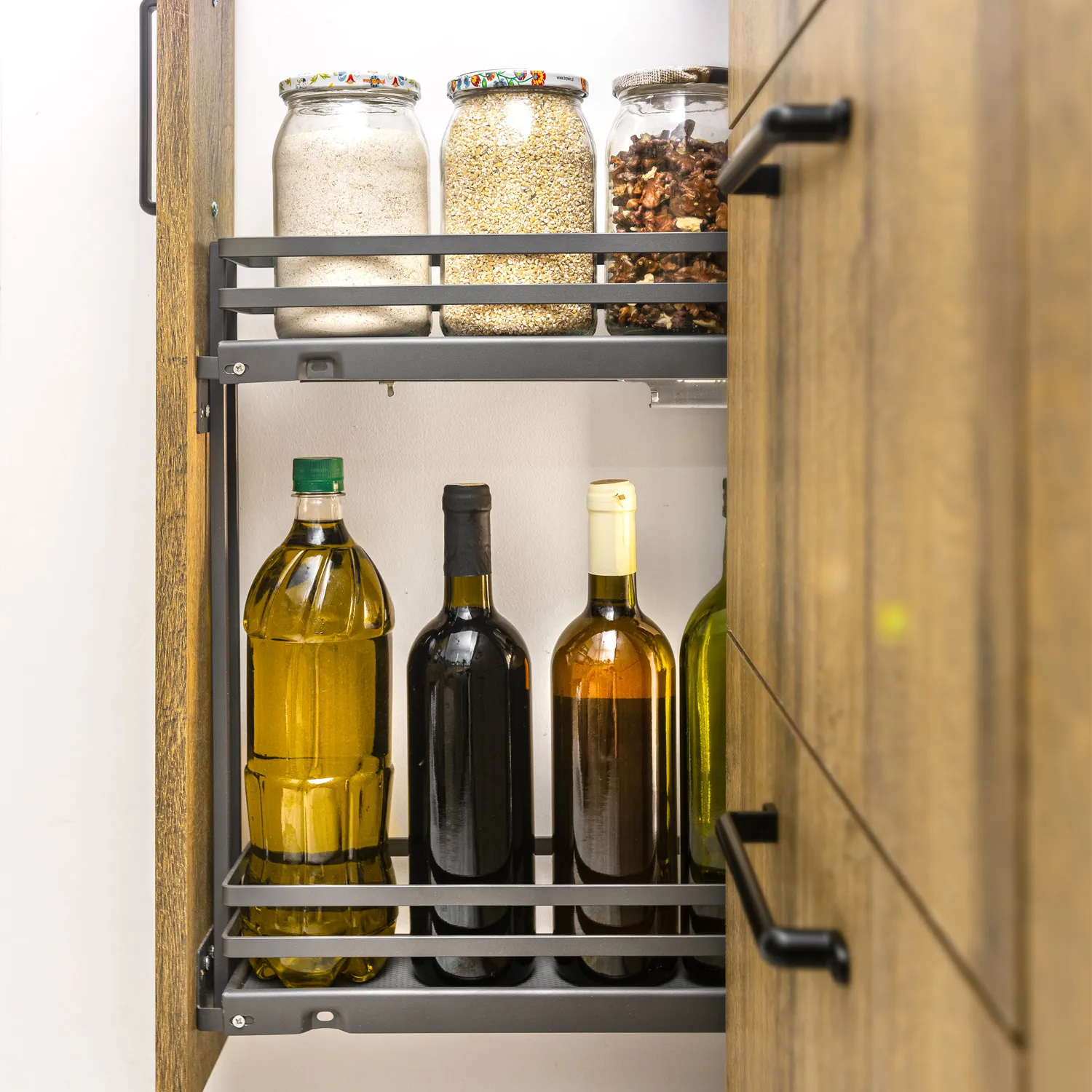 Cargo pracuje na prowadnicach z funkcją pełnego wysuwu i cichego domyku. Pełny wysuw zapewnia łatwy i wygodny dostęp do zawartości szafki, a samodociąg z hamulcem gwarantuje ciche domykanie.