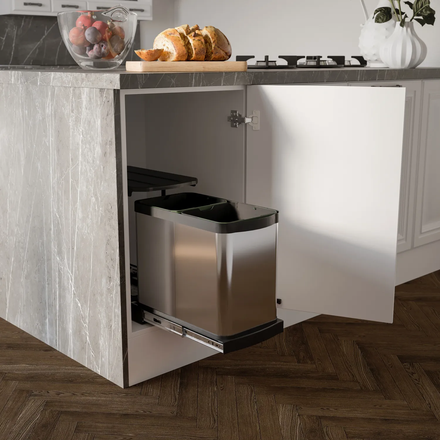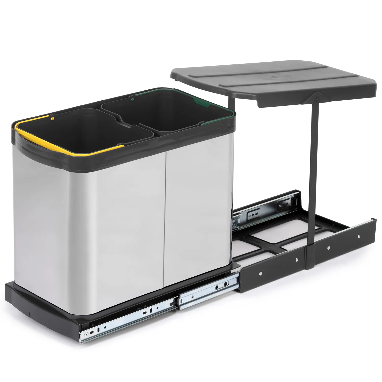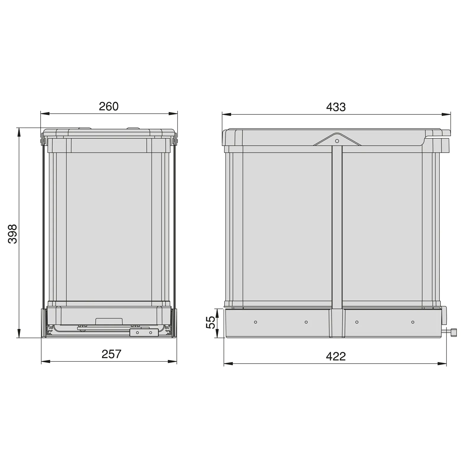 Kosz pojemnik na śmieci wysuwany 2x12L w kolorze inox to bardzo duże udogodnienie w nowoczesnej kuchni. Takie przestrzenie słyną ze sprytnych rozwiązań, które pozwalają na zaoszczędzenie miejsca. Kosz przeznaczony jest do montażu w szafce. Prowadnice umożliwiają pełne wysunięcie. Kosz wyposażony jest w dwa 12-litrowe pojemniki. Pojemniki posiadają uchwyty ułatwiające wyjmowanie, dzięki czemu łatwo jest opróżniać i czyścić kosz. Kosz może być wysuwany z szafki ręcznie lub automatycznie po przymocowaniu do frontu.
