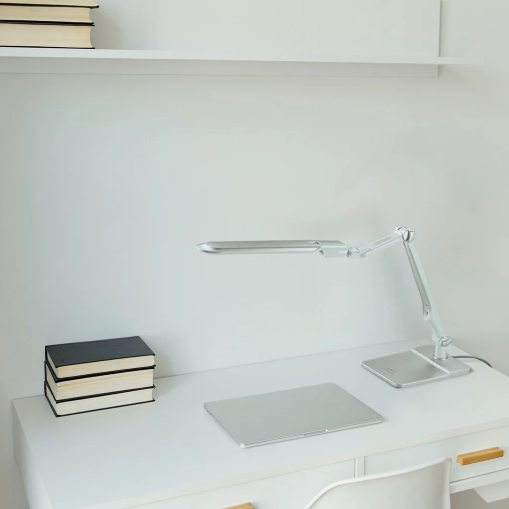 Lampka biurkowa K-BL1207 Srebrna z serii MICA świetnie prezentuje się na każdym modelu biurka, również na małych meblach. Jej ramie “łamie się” w trzech punktach. Przy samym kloszu, przy łączeniu dwóch części ramienia, oraz przy podstawie lampka może być regulowana. Daje to możliwość ustawienia lampki pod kątem najbardziej satysfakcjonującym nowego nabywcę. Co więcej regulacja przy podstawie obejmuje także możliwość obracania ramienia wokół własnej osi. Lampa wyposażona jest także w 3-stopniowy tryb zmiany temperatury barwy (zimna, neutralna oraz ciepła).