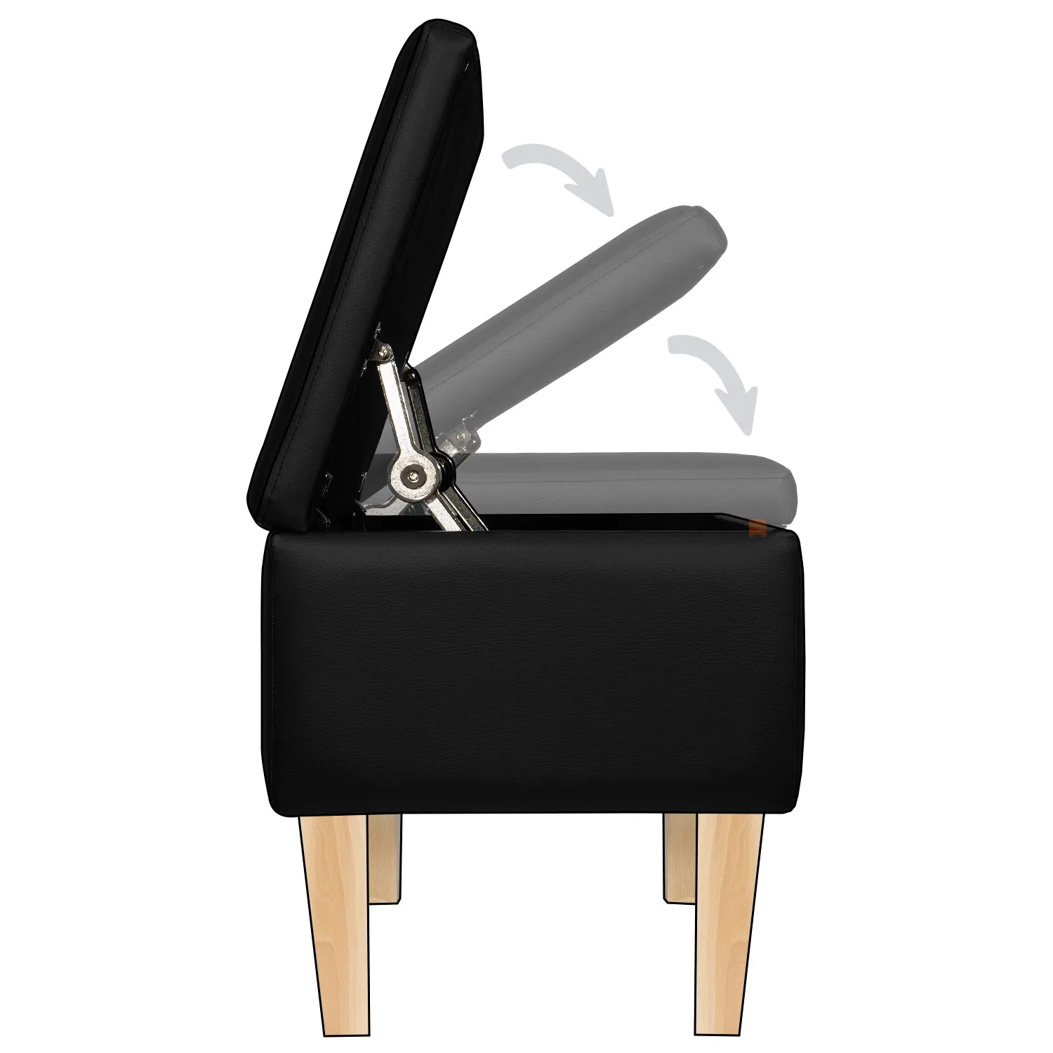 Tkanina wewnątrz ławki jest czarna, dlatego do produkcji ławki wykorzystano również czarne zawiasy, dzięki czemu nie rzucają się one w oczy, a ławka wygląda schludnie i elegancko.