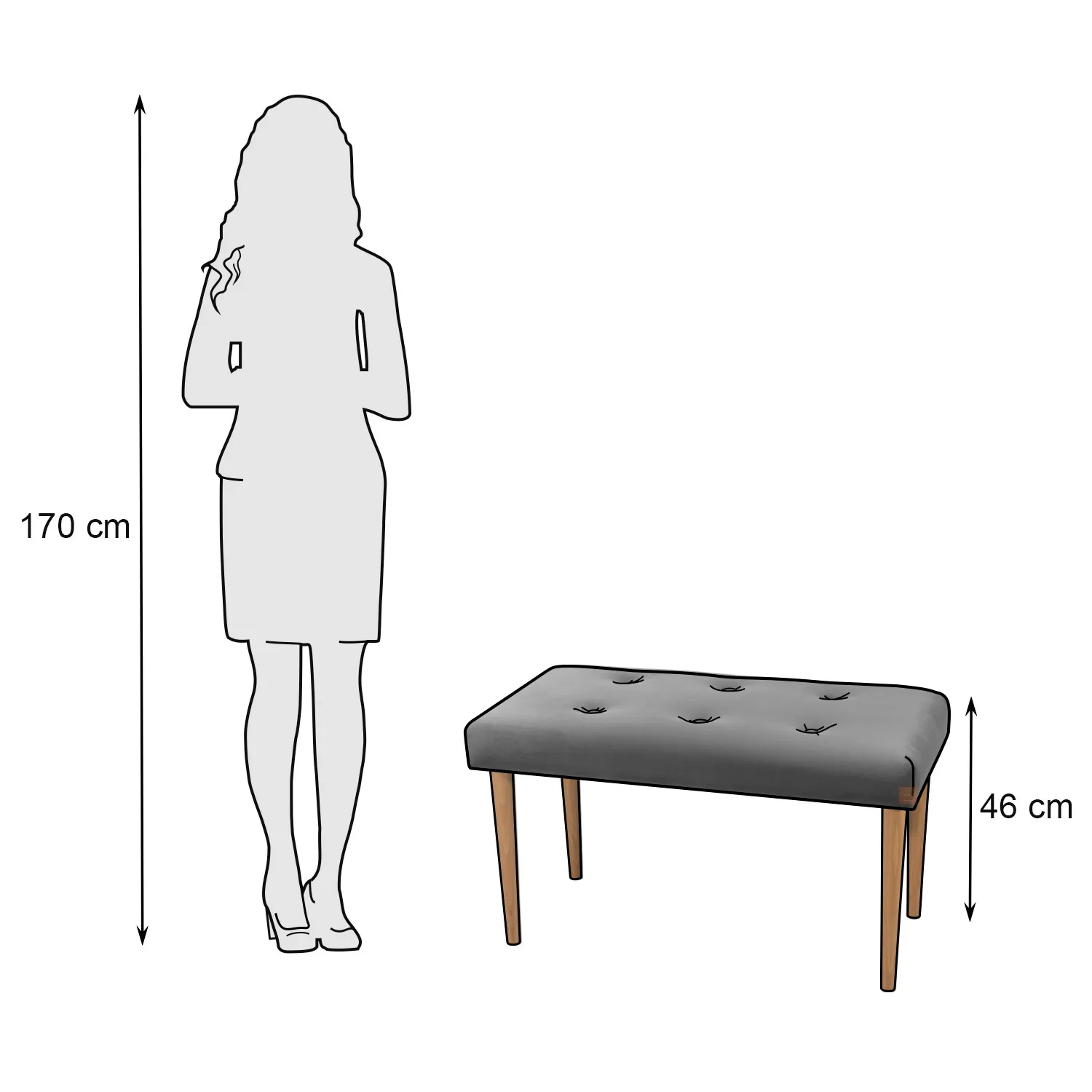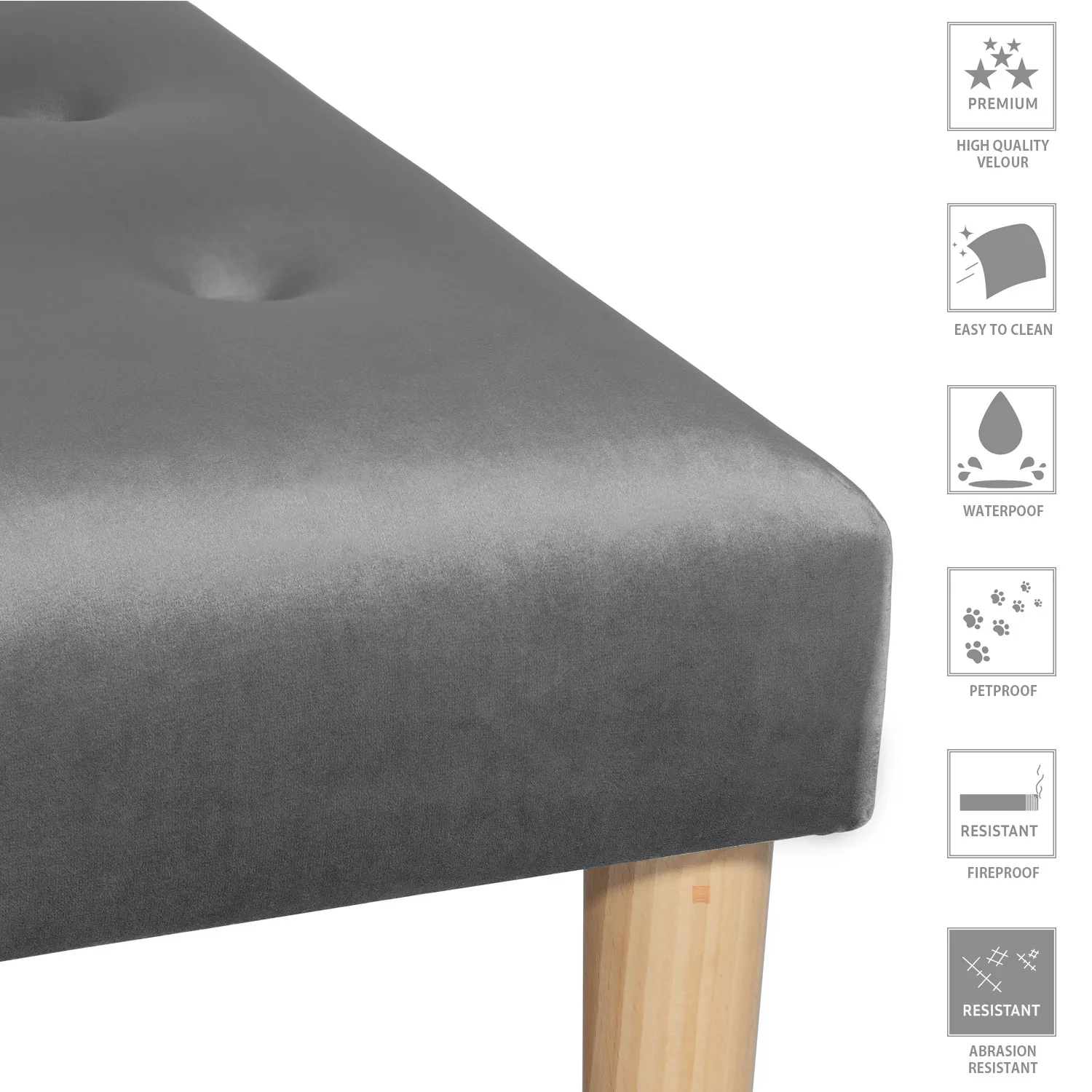 Nogi siedziska zostały wykonane z drewna bukowego, dzięki czemu są solidne i trwałe. Drewno bukowe charakteryzuje się dużą twardością oraz odpornością na zarysowania i inne uszkodzenia. Nogi są lakierowane, dzięki czemu zostały zabezpieczone przed działaniem wody, promieniowaniem UV i zabrudzeniami. Bukowe nogi dają pewność stabilności i wytrzymałości ławki tapicerowanej.