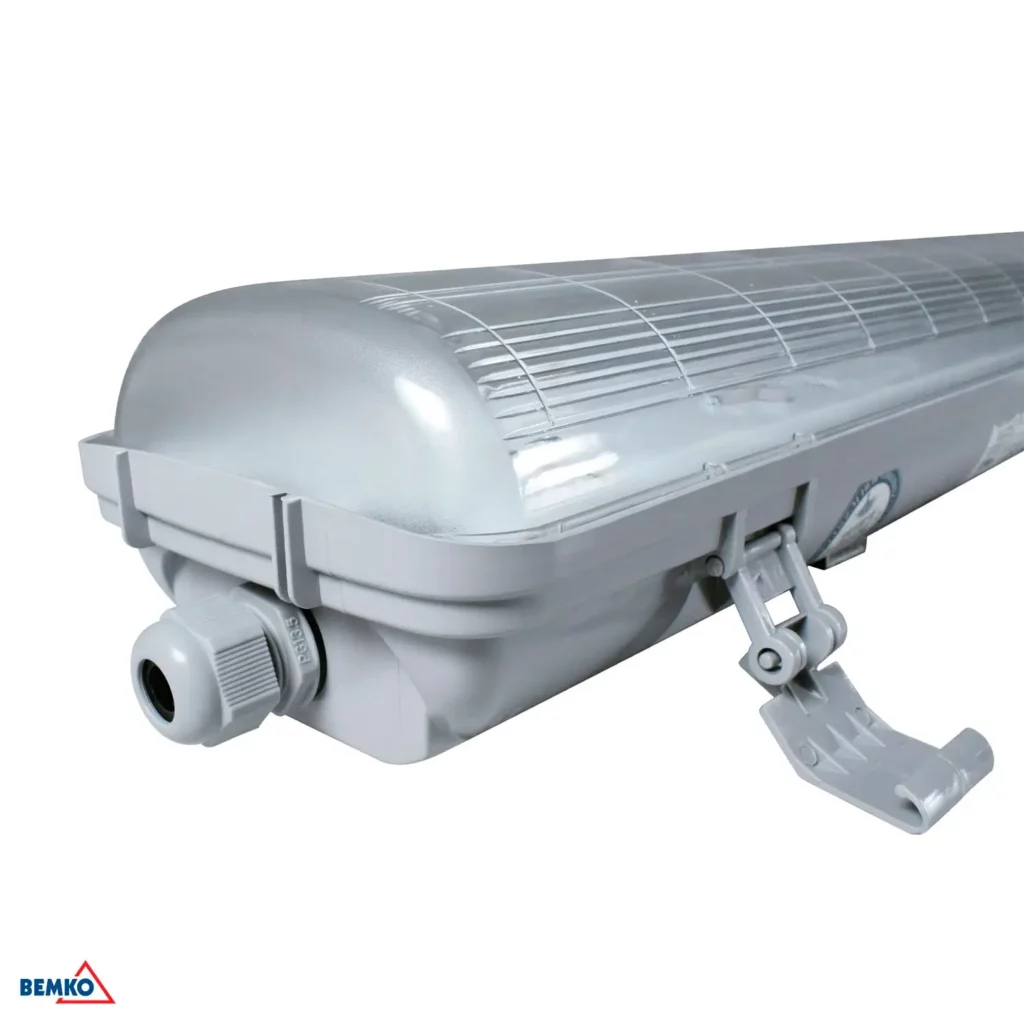 Oprawa hermetyczna Lampa ALWAR EMPTY 2x36W IP65 1260MM BEMKO przeznaczona jest do oświetlenia pomieszczeń cechujących się dużym zapyleniem i wilgotnością, takich jak: warsztaty garaże, magazyny, sklepy itp. Obudowa i klosz zostały wykonane z wysokiej jakości tworzywa sztucznego i zaprojektowane w taki sposób, aby spełniały normy szczelności IP65 i wytrzymałości IK08.