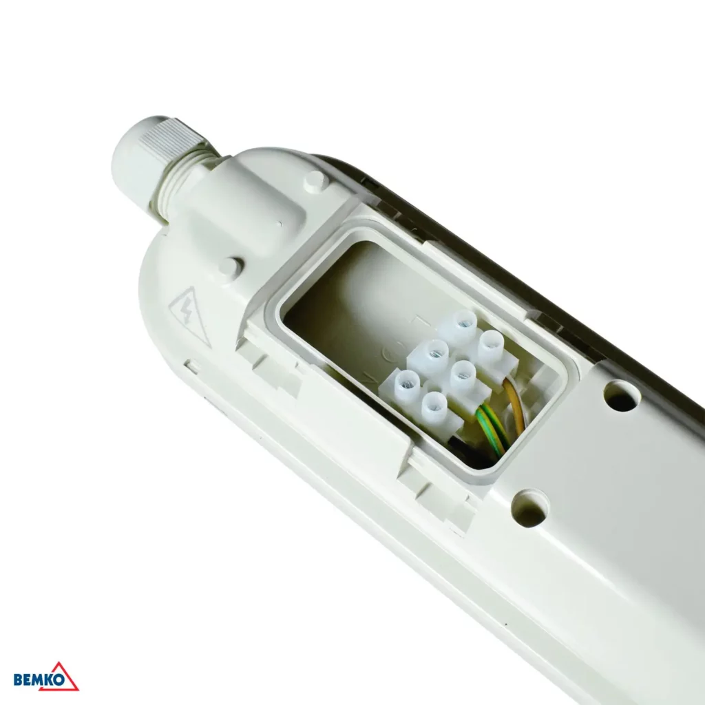 Oprawa hermetyczna Lampa LED BALWIR 33W 4000K 4950LM BEMKO przeznaczona jest do oświetlenia pomieszczeń cechujących się dużym zapyleniem i wilgotnością, takich jak: warsztaty garaże, magazyny, sklepy itp. Obudowa i klosz zostały wykonane z wysokiej jakości tworzywa sztucznego i zaprojektowane w taki sposób, aby spełniały normy szczelności IP65 i wytrzymałości IK08.