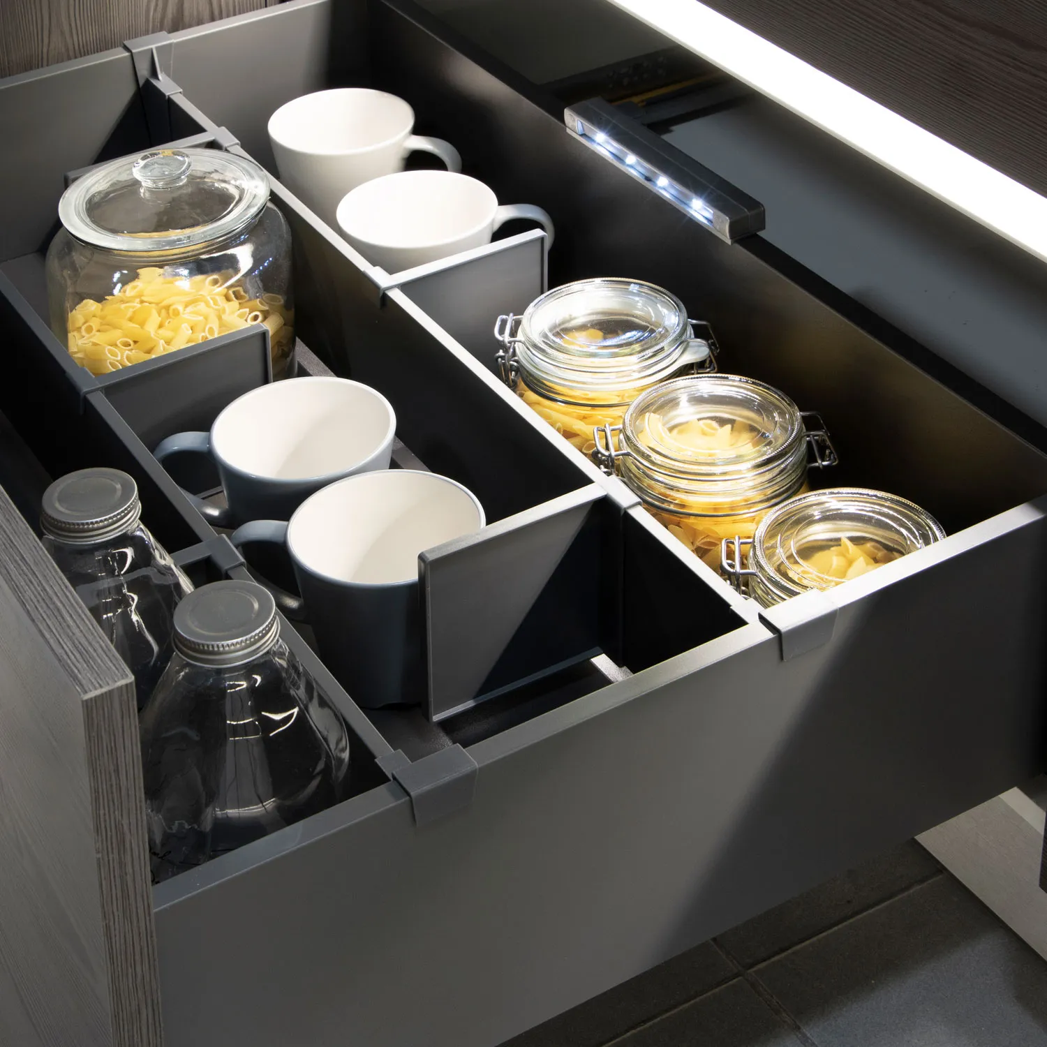 Organizer przegroda do szuflady 600mm pomaga zorganizować przestrzeń wewnątrz szuflad kuchennych, łazienkowych itp. przeznaczony jest do modułów o szerokości 600 mm oraz minimalnej głębokości szuflady 350 mm. Można go jednak dostosować do węższych szuflad, docinając profile aluminiowe.