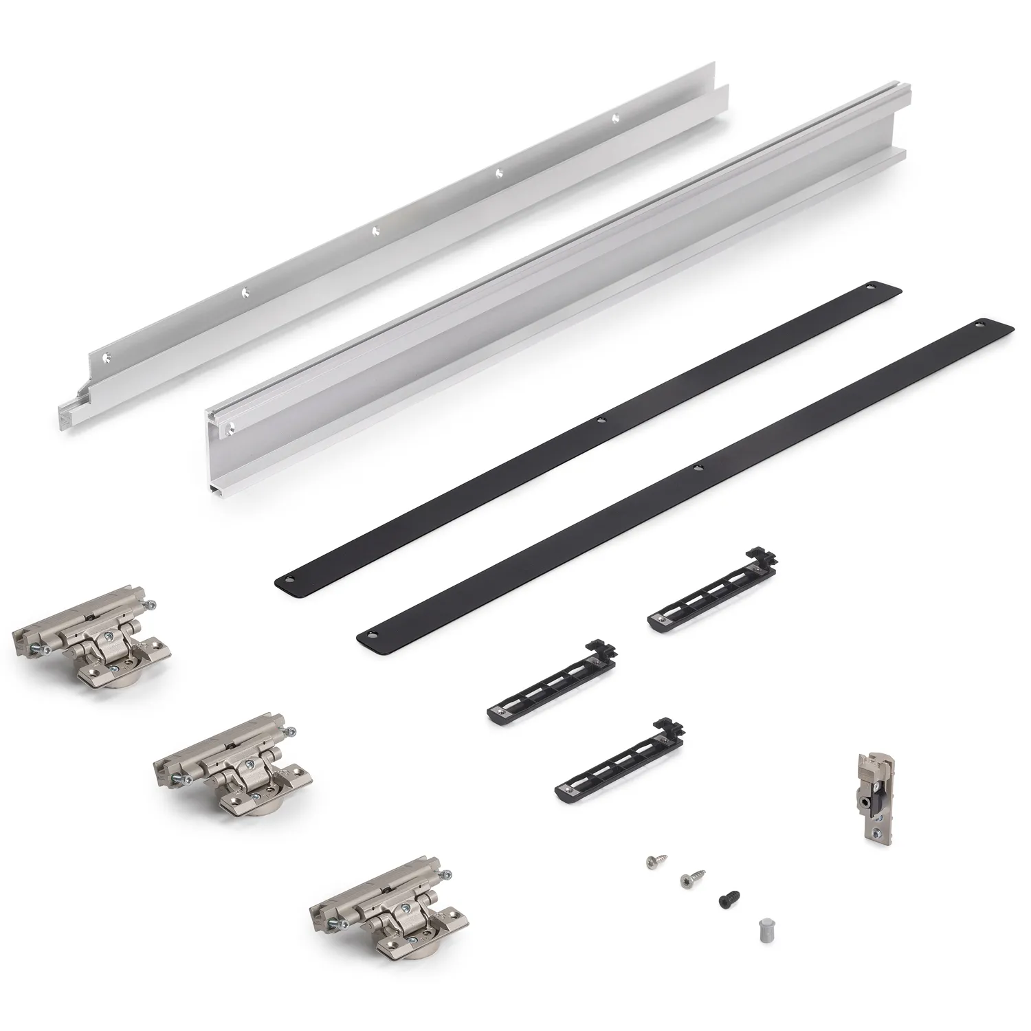 | Produkt zawiera | Akcesoria montażowe i regulacyjne do zawiasów, zawiasy puszkowe z miękkim zamykaniem, magnetyczne profile prowadzące, górna i dolna szyna, śruby montażowe |