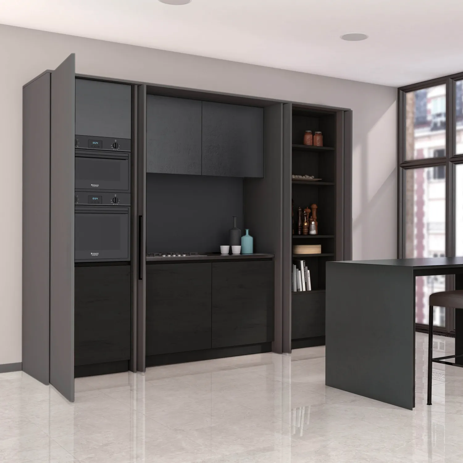 System przesuwnych drzwi Concepta3 to doskonałe rozwiązanie do otwartych przestrzeni mieszkaniowych. System ukrytych drzwi przesuwnych umożliwia ukrycie drzwi w niewielkiej bocznej wnęce wewnątrz szafy lub między szafą a ścianą. Umożliwia schowanie przestrzeni lub obszaru roboczego z zachowaniem zintegrowanej estetyki z pomieszczeniem.