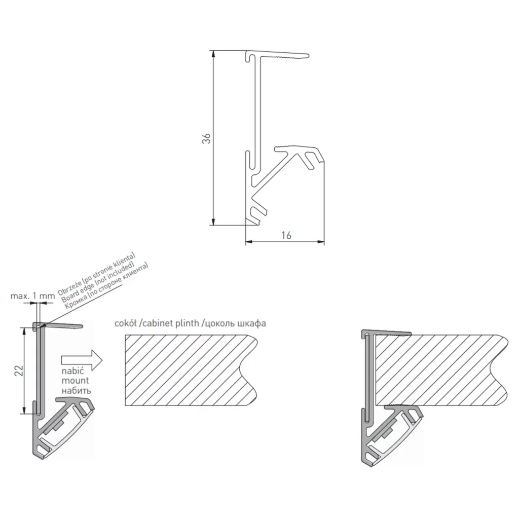 Profil aluminiowy LED cokołowy nabijany GLAX 3m – srebrny idealnie nadaje się do wykończenia pomieszczeń takich jak łazienka, kuchnia, garderoba, sypialnia czy też sklep. Zastosowanie profilu LED cokołowego umożliwia estetyczne oświetlenie dołów szafek. Dzięki użyciu profilu LED cokołowego można oświetlić szafki oraz podłogę.