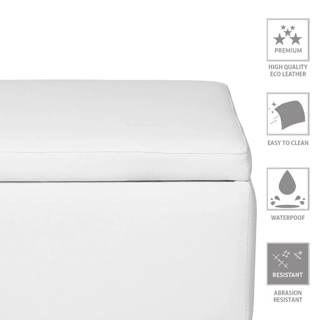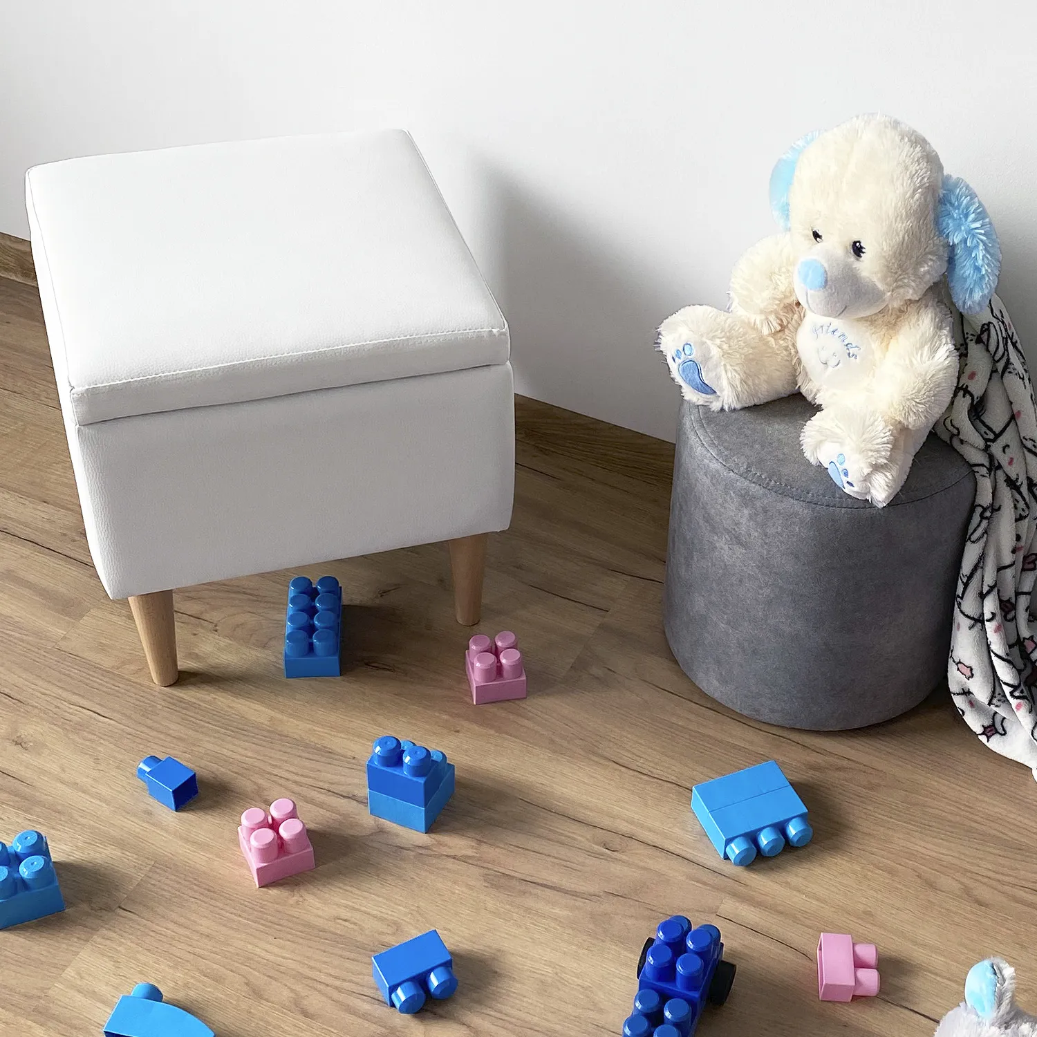 Pufa otwierana skrzynia JOHNSON NAT – biała eco to wygodna, ręcznie wykonana ławka do przedpokoju lub innych pomieszczeń. Ze względu na niedużą wysokość pufa doskonale nadaje się również do pokoju dziecięcego. Schowek w pufie może posłużyć jako pojemnik na zabawki. Pufa została obita wysokiej jakości materiałem PREMIUM, który jest odporny na przetarcia i uszkodzenia oraz łatwy w czyszczeniu. Nogi siedziska zostały wykonane z drewna bukowego, dzięki czemu są solidne i trwałe. Siedzisko jest grube, co znacząco wpływa na komfort siedzenia na pufie.