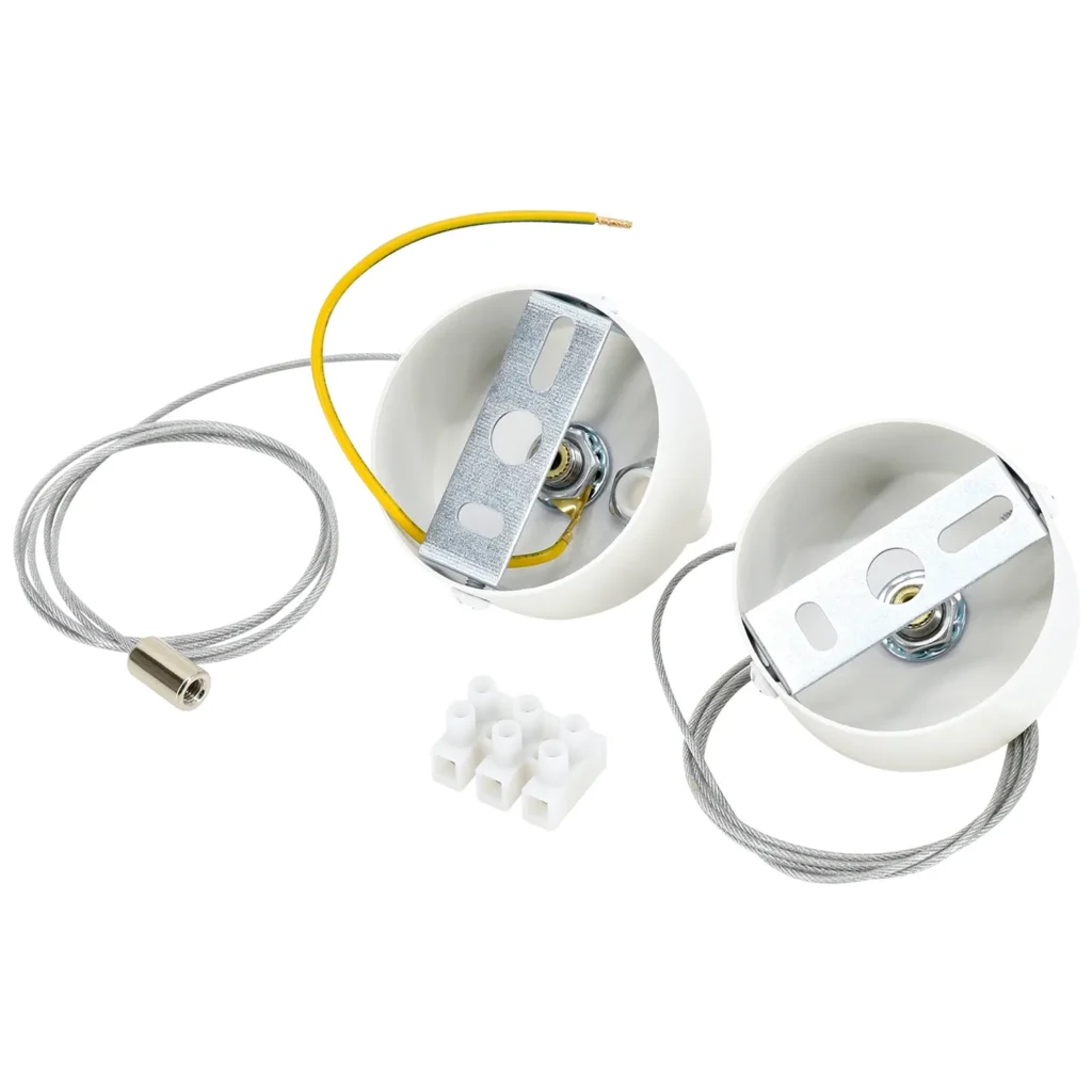Białe, okrągłe rozety sufitowe są przeznaczone do montażu oprawy LORIEN. Wyposażone w linkę o długości 100 cm, umożliwiają elastyczne dostosowanie wysokości lampy, idealnie komponując się z nowoczesnymi, minimalistycznymi aranżacjami wnętrz. Zestaw składa się z dwóch sztuk rozet.