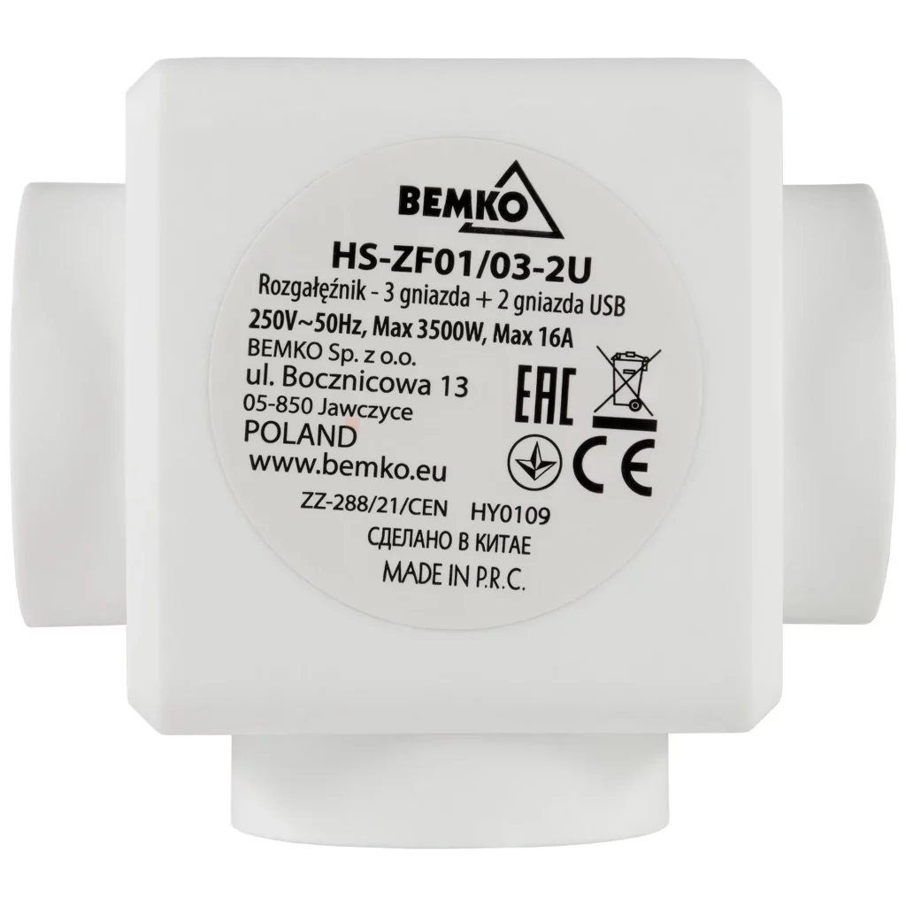 Rozgałęźnik sieciowy 3 gniazda 16A + 2xUSB (max 2.4A) jest produktem polskiego producenta Bemko, specjalizującego się w produkcji sprzętu oświetleniowego i elektrotechnicznego.
