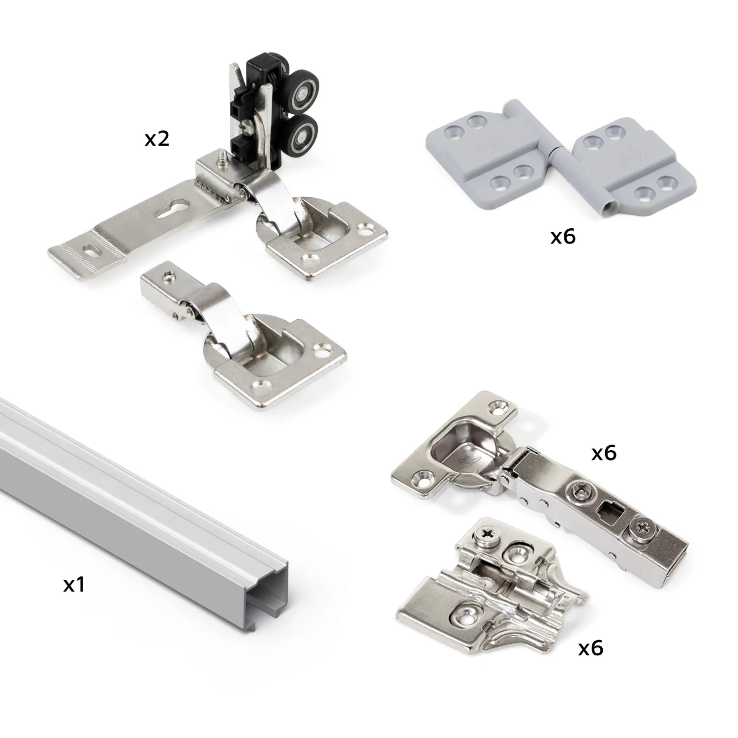 | Produkt zawiera | 1 Górny profil 2.35m, 2 Górne wózki, 2 Dolne wózki, 6 Zawiasów centralnych, 6 Zawiasów bocznych, 6 Dodatków do zawiasów, Wkręty montażowe |