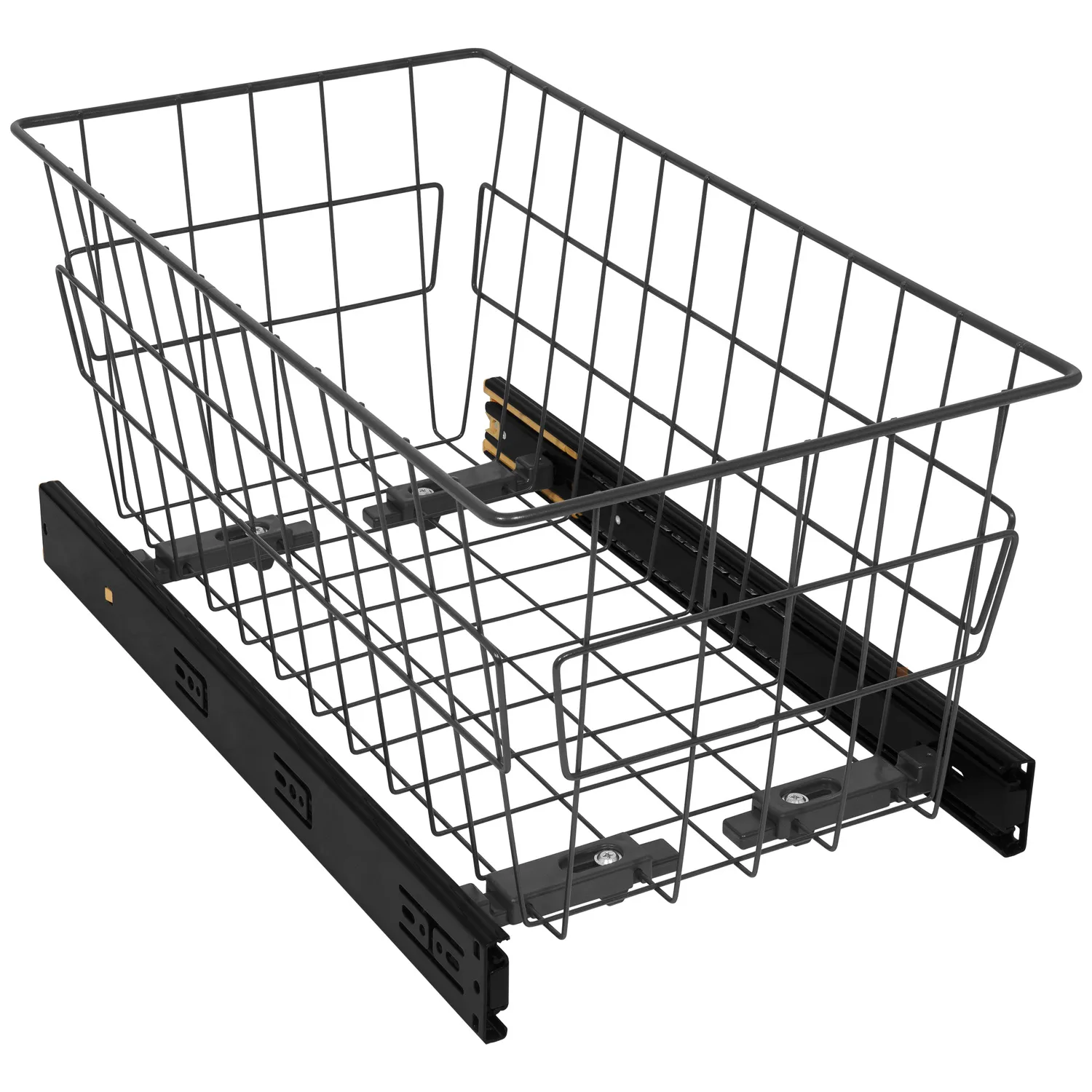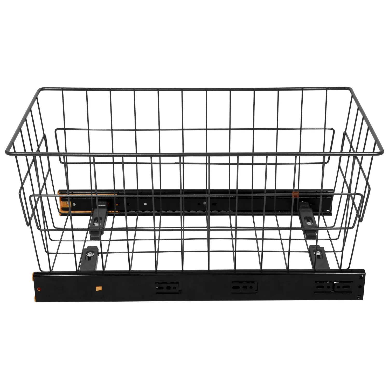 Szuflada MD sprzedawana jest w zestawie z czarnymi prowadnicami kulkowymi H-45 z pełnym wysuwem i cichym domykiem. System pełnego wysuwu zapewnia łatwy i nieograniczony dostęp do zawartości szuflady. Samodociąg gwarantuje ciche domykanie. Dodatkową zaletą jest łatwy montaż i demontaż szuflady z części prowadnic.