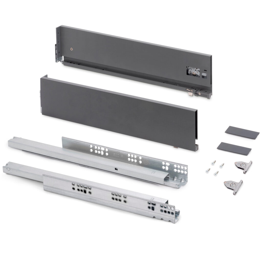 System szuflad jest tak skonstruowany, żeby nie tylko zapewnić cichą pracę prowadnic, ale również w pełni zabezpieczyć fronty przed uszkodzeniem w przypadku użycia znacznej siły przy zamykaniu. Do produkcji użyto wysokiej klasy stali ocynkowanej, a model w kolorze antracytowym bez problemu będzie można dopasować do wielu rodzajów mebli kuchennych.