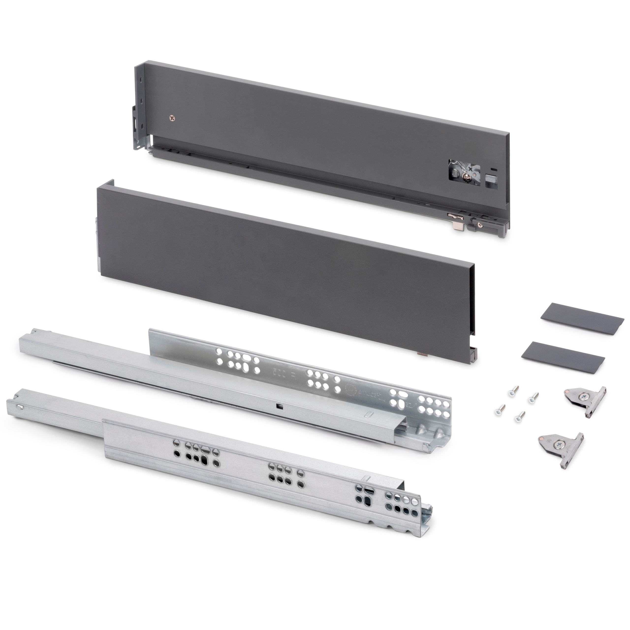 | Zestaw zawiera | Dwa metalowe boki, Dwie prowadnice, Dwa metalowe mocowania frontu, Dwie plastikowe zaślepki na boki, Wkręty |