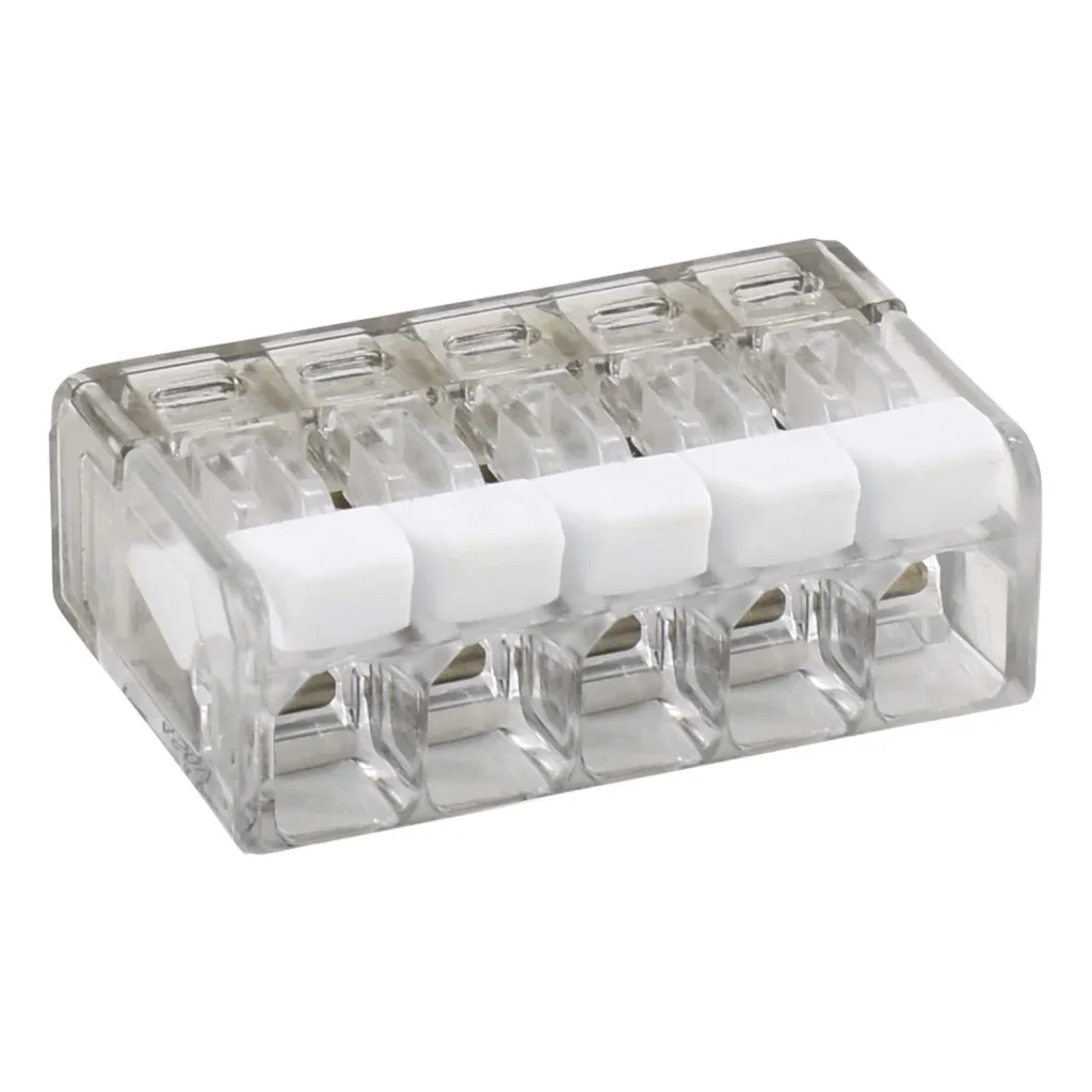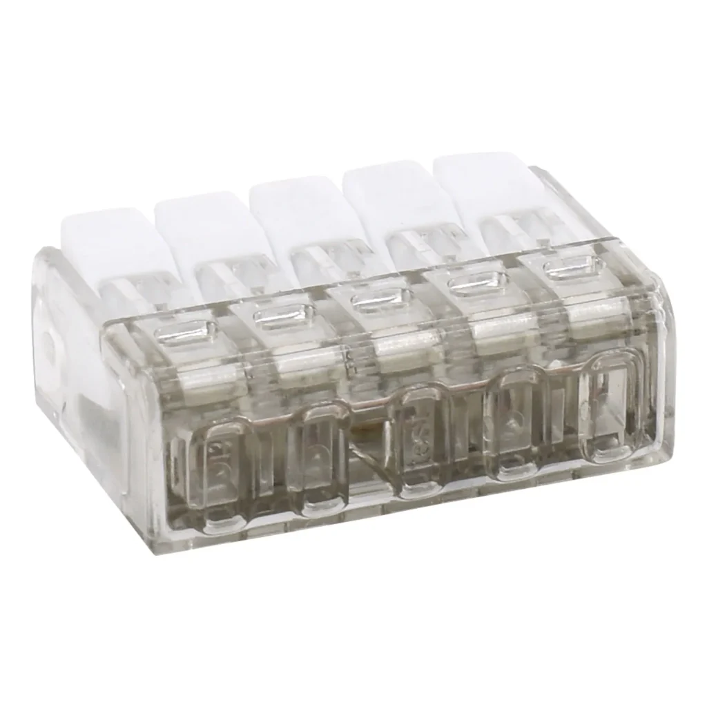 Szybkozłączki na drut 5×2.5mm M05 służą do łączenia przewodów. Można ją stosować między innymi w szafkach rozdzielczych czy puszkach elektroinstalacyjnych. Dzięki niewielkim rozmiarom można ją stosować na małej przestrzeni. Model wyposażony jest w dźwignię otwierającą zacisk co wpływa na duży komfort użytkowania oraz gwarantuje pewny ścisk przewodu. Transparentny kolor ułatwia połączenia. Produkt posiada okienko testowe.