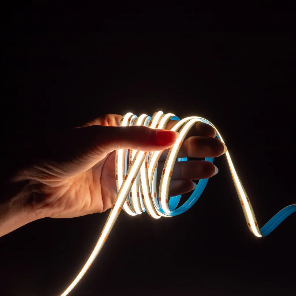 Taśma LED posiada diody typu COB, emitujące jednolitą linię światła, bez widocznych punktów świetlnych. Światło emitowane przez taśmę COB charakteryzuje się brakiem przebarwień, zaciemnień czy dziwnych plam innego koloru.