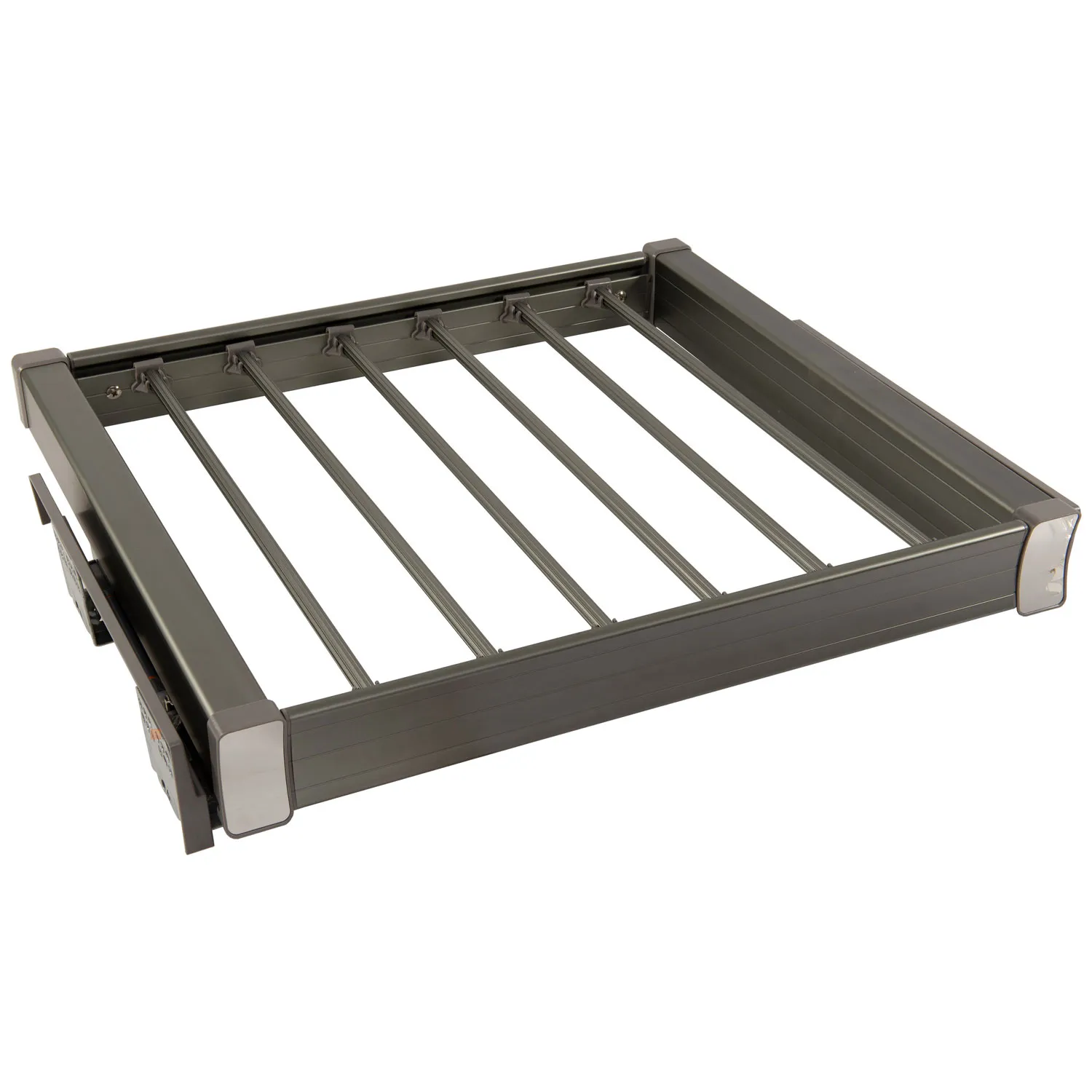 Wysuwany wieszak na spodnie w prezentowanej wersji DX004 jest przeznaczony do szafek o szerokości 900 mm i umożliwia powieszenie wielu par spodni jednocześnie. Model został wyposażony w dwa systemy, które warto poznać z bliska. Pierwszy to system pełnego wysuwu, który umożliwia wysunięcie wieszaka poza obrys szafy. Drugi to opcja cichego domykania, realizowana przez samodociąg z hamulcem, która zapewnia mało hałasu podczas zasuwania wieszaka.