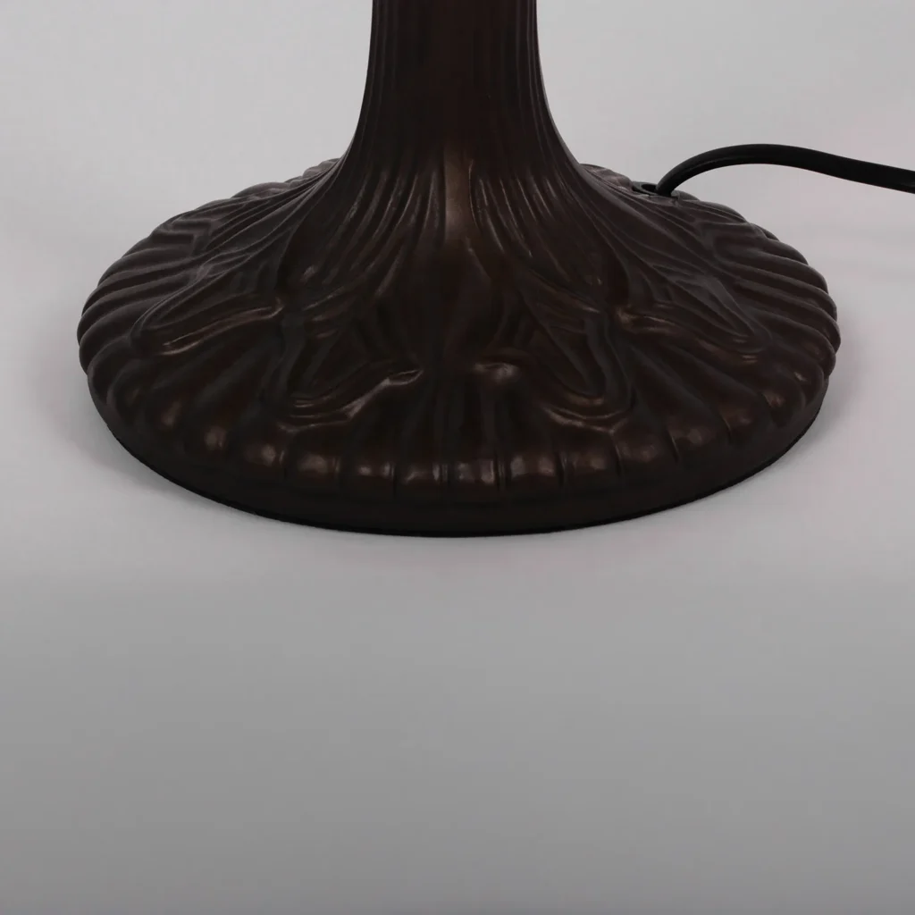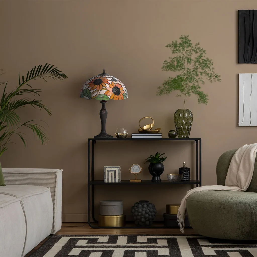 Witrażowa lampa stołowa K-G16814 z serii SUNFLOWER łączy funkcjonalność z elegancją, przyciągając wzrok pięknym kloszem z motywem słoneczników w odcieniach pomarańczu i zieleni. Ręcznie cięte i precyzyjnie złożone kawałki szkła tworzą wyjątkowy wzór, który delikatnie rozprasza światło, wprowadzając do wnętrza ciepłą atmosferę. Solidna podstawa w kolorze antycznego brązu nadaje lampie ponadczasowy charakter, pasujący do różnych stylów aranżacji. Dzięki dwóm gniazdom E27, lampa pozwala na regulację intensywności oświetlenia, idealnie dopasowując się do różnych potrzeb i okazji.