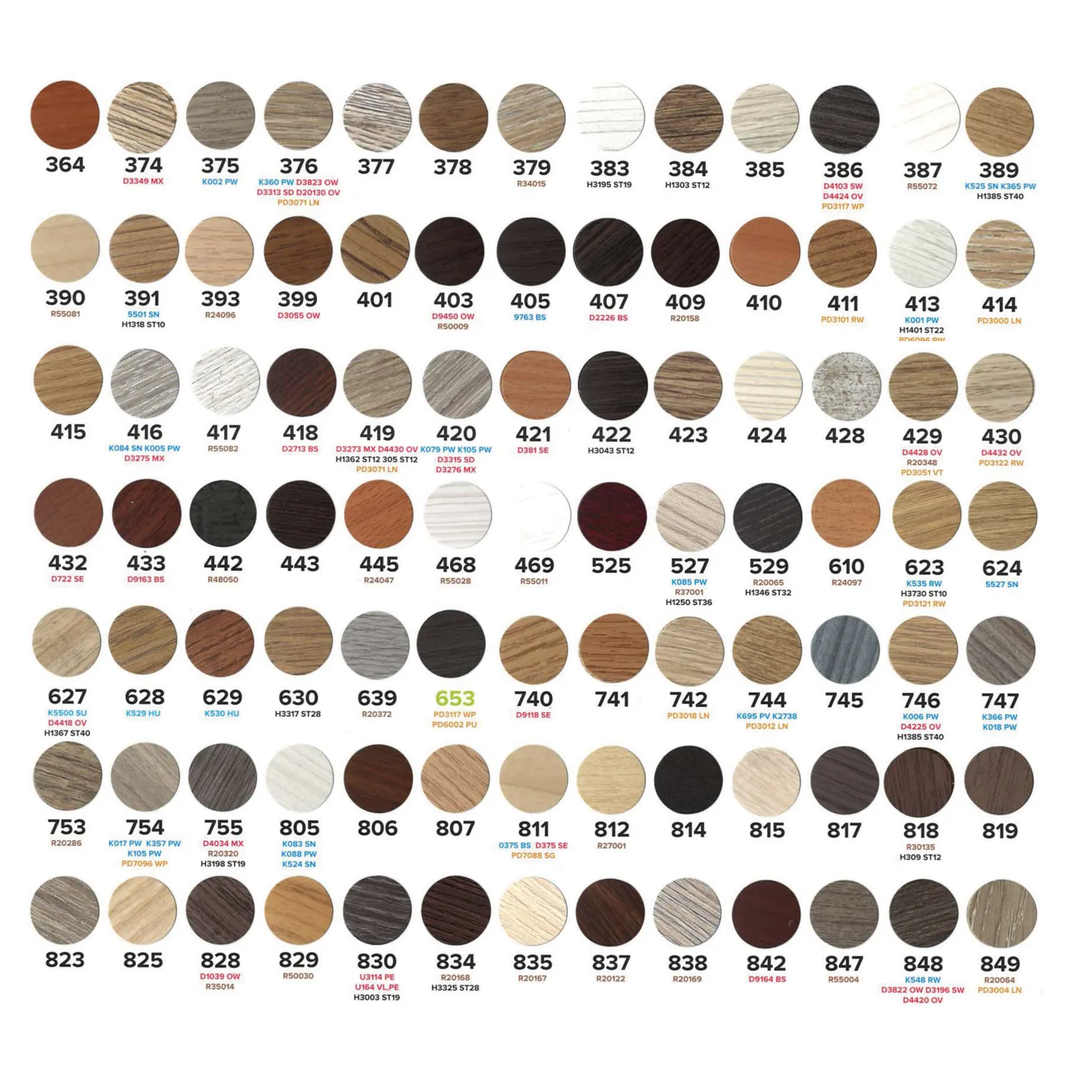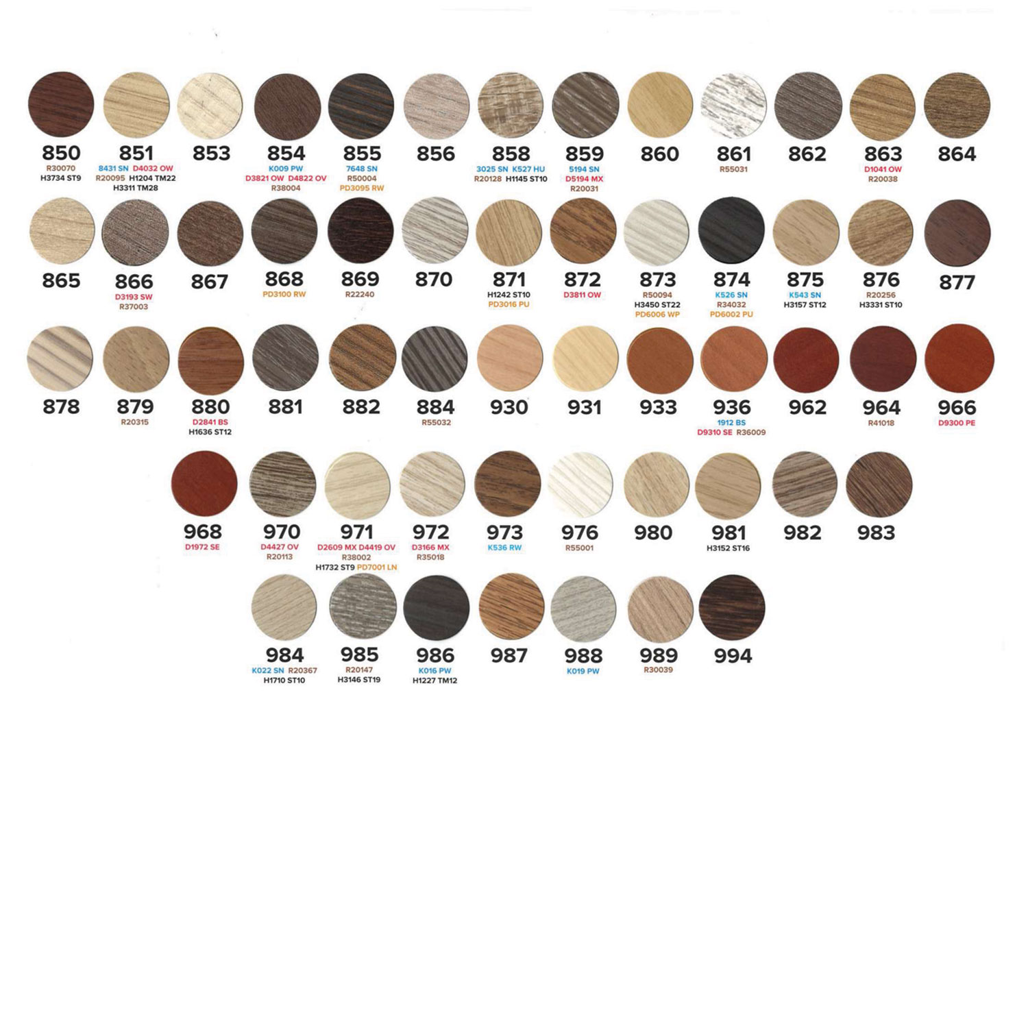 Poniższe oznaczenia odpowiadają kodom dekorów płyt meblowych stosowanych przez producentów takich jak Kronospan, Swiss Krono, Egger, Pfleiderer, Woodeco.