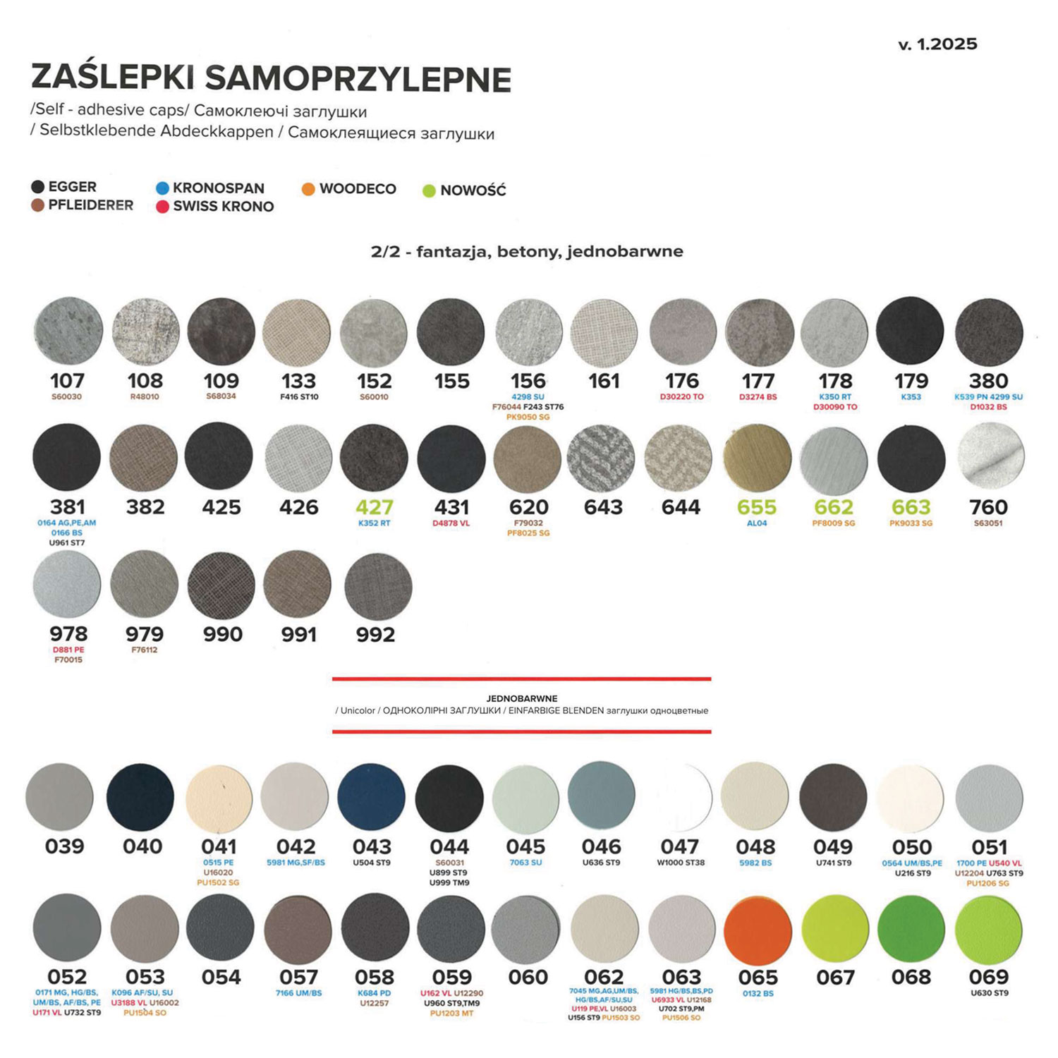 Zaślepki są dopasowane kolorystycznie do popularnych dekorów płyt meblowych renomowanych producentów.