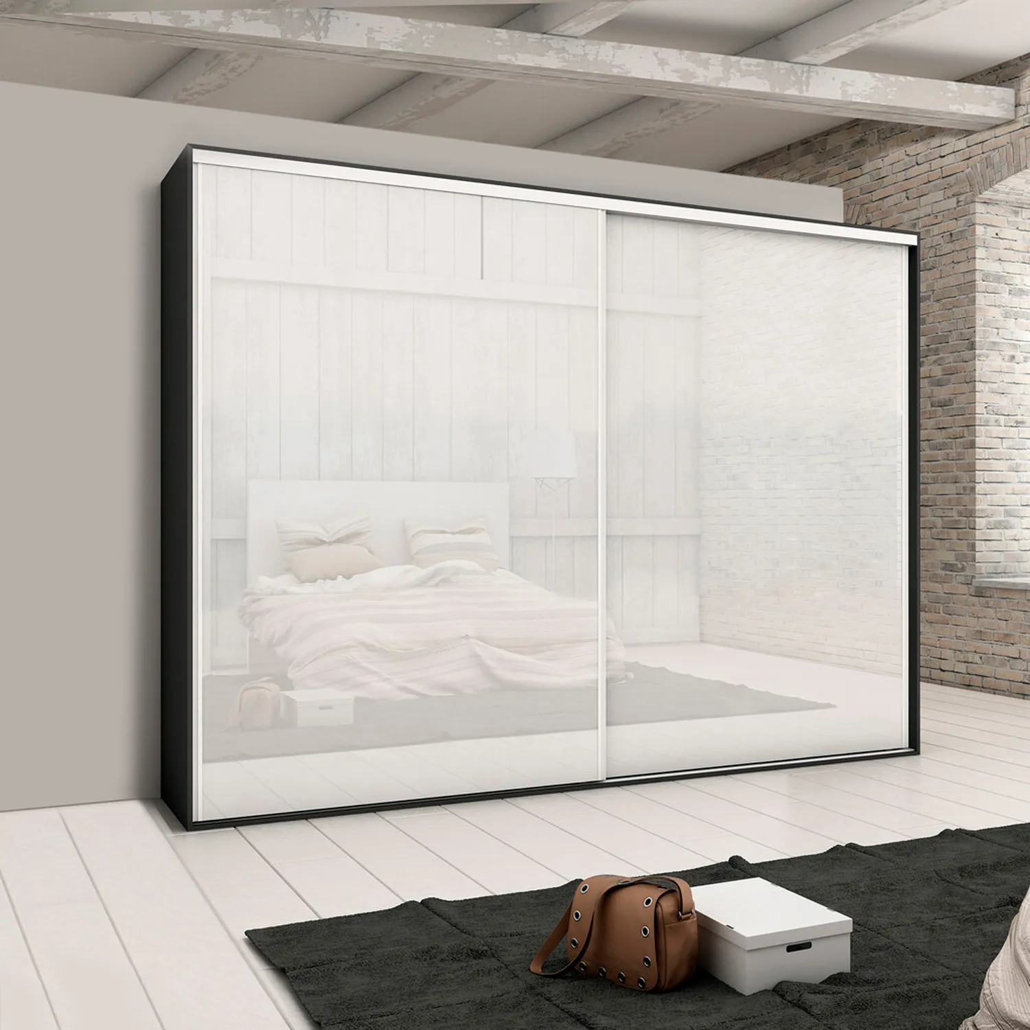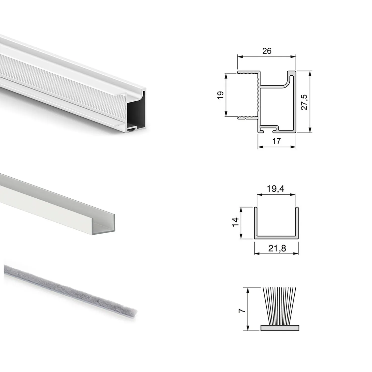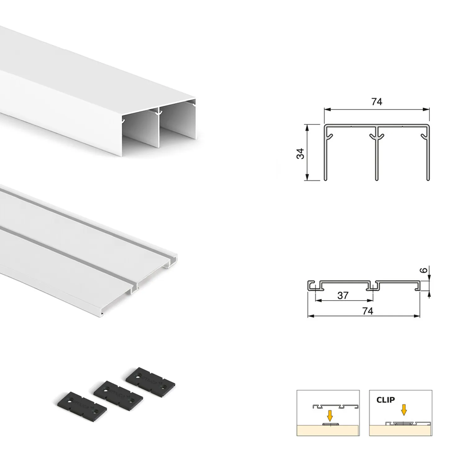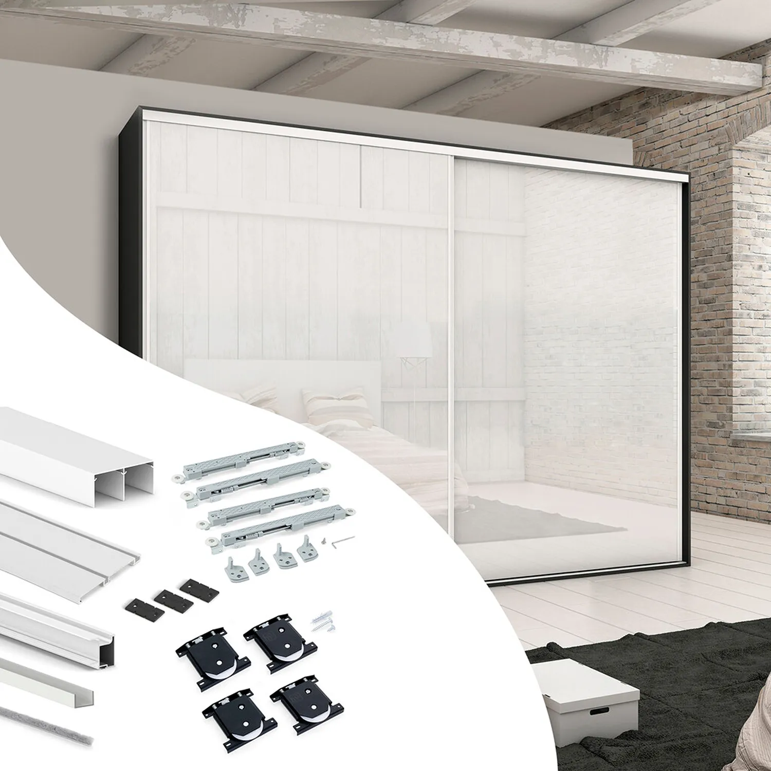 Zestaw do szafy Placard z dwoma przesuwanymi drzwiami zawiera kompletny osprzęt i profile niezbędne do montażu systemu – z wyjątkiem płyty meblowej. Umożliwia stworzenie funkcjonalnej szafy lub garderoby z dwoma drzwiami przesuwnymi, opartymi na dolnym prowadzeniu, zapewniającym cichą i płynną pracę.